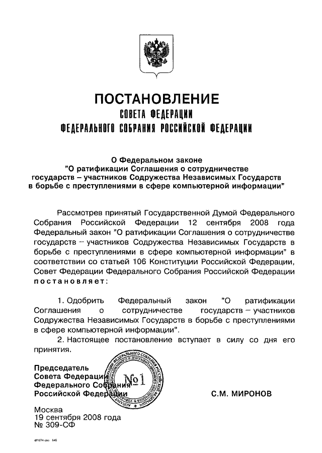 ПОСТАНОВЛЕНИЕ СФ ФС РФ от 19.09.2008 N 309-СФ