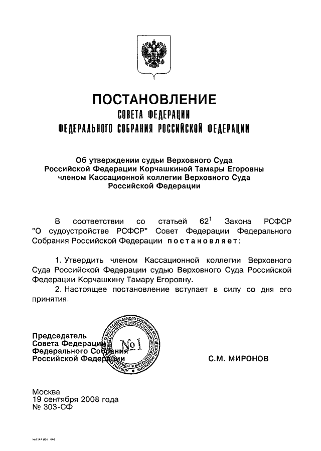 ПОСТАНОВЛЕНИЕ СФ ФС РФ от 19.09.2008 N 303-СФ