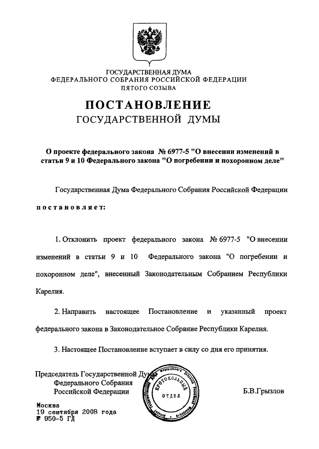ПОСТАНОВЛЕНИЕ ГД ФС РФ от 19.09.2008 N 950-5 ГД