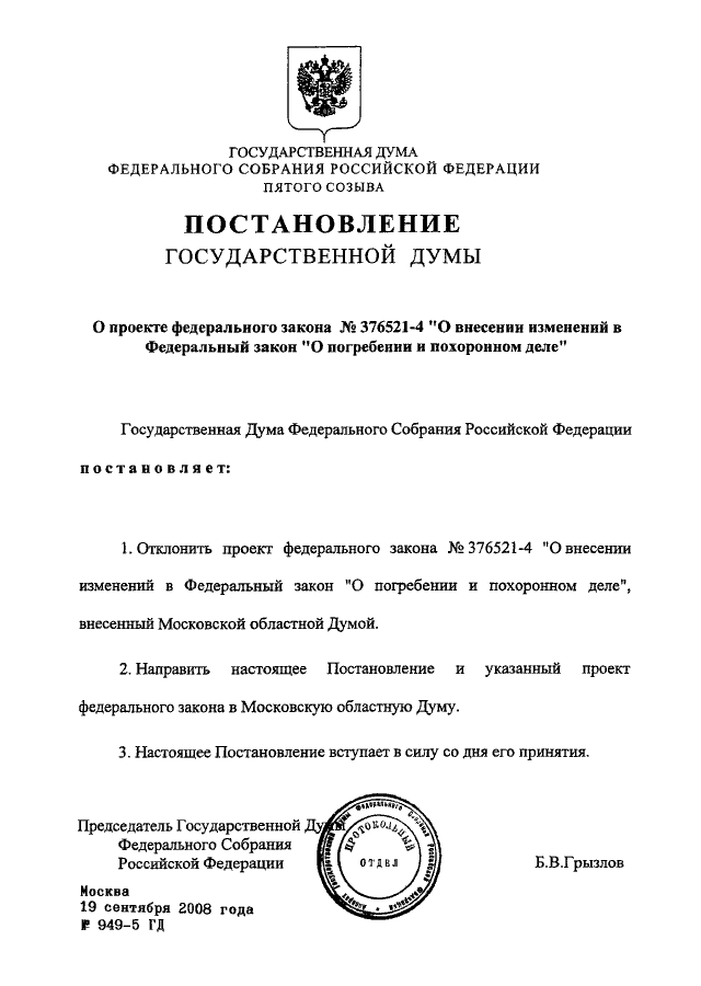 ПОСТАНОВЛЕНИЕ ГД ФС РФ от 19.09.2008 N 949-5 ГД
