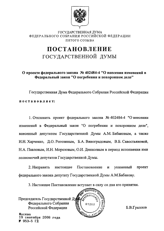 ПОСТАНОВЛЕНИЕ ГД ФС РФ от 19.09.2008 N 953-5 ГД