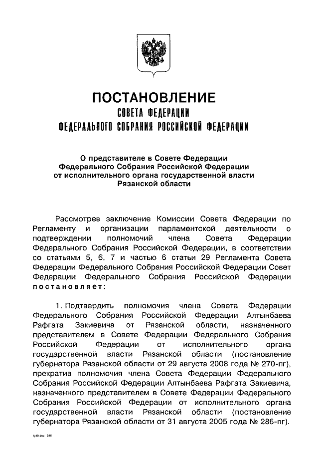 "О ПРЕДСТАВИТЕЛЕ В СОВЕТЕ ФЕДЕРАЦИИ ФЕДЕРАЛЬНОГО СОБРАНИЯ РОССИЙСКОЙ ФЕДЕРАЦИИ ОТ ИСПОЛНИТЕЛЬНОГО ОРГАНА ГОСУДАРСТВЕННОЙ ВЛАСТИ РЯЗАНСКОЙ ОБЛАСТИ"