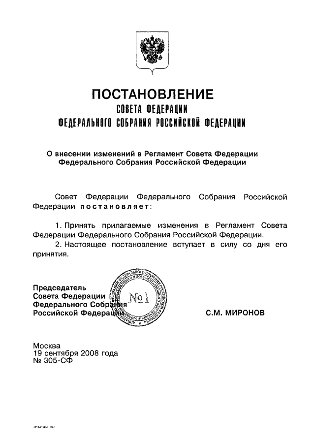 ПОСТАНОВЛЕНИЕ СФ ФС РФ от 19.09.2008 N 305-СФ