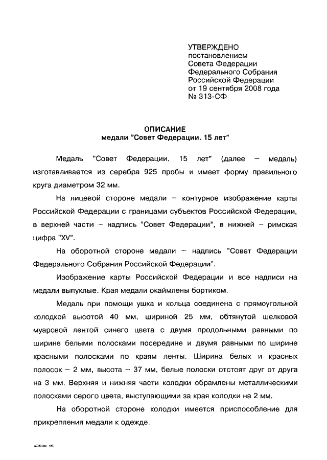 ПОСТАНОВЛЕНИЕ СФ ФС РФ от 19.09.2008 N 313-СФ