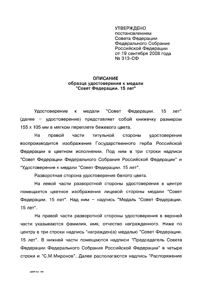 ПОСТАНОВЛЕНИЕ СФ ФС РФ от 19.09.2008 N 313-СФ