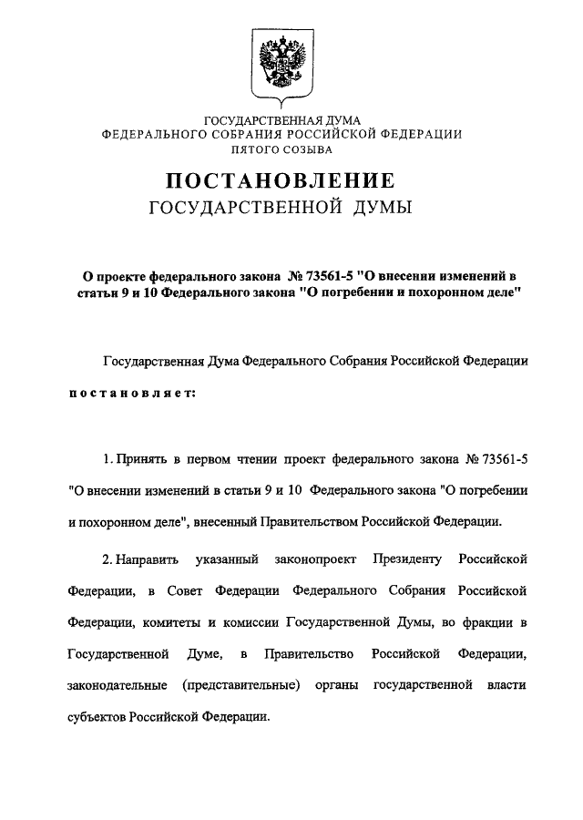 "О ПРОЕКТЕ ФЕДЕРАЛЬНОГО ЗАКОНА N 73561-5 "О ВНЕСЕНИИ ИЗМЕНЕНИЙ В СТАТЬИ 9 И 10 ФЕДЕРАЛЬНОГО ЗАКОНА "О ПОГРЕБЕНИИ И ПОХОРОННОМ ДЕЛЕ"