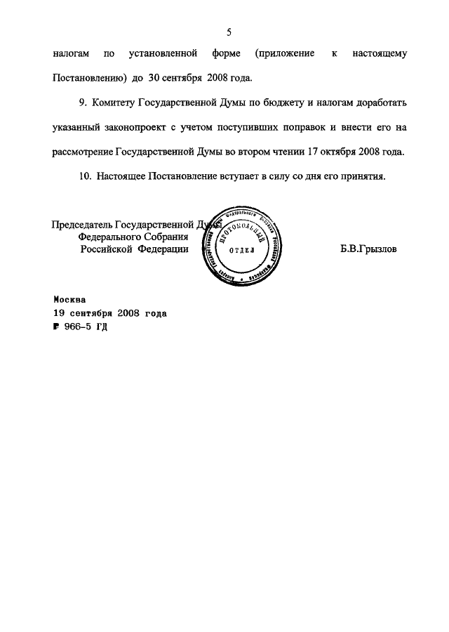 ПОСТАНОВЛЕНИЕ ГД ФС РФ от 19.09.2008 N 966-5 ГД