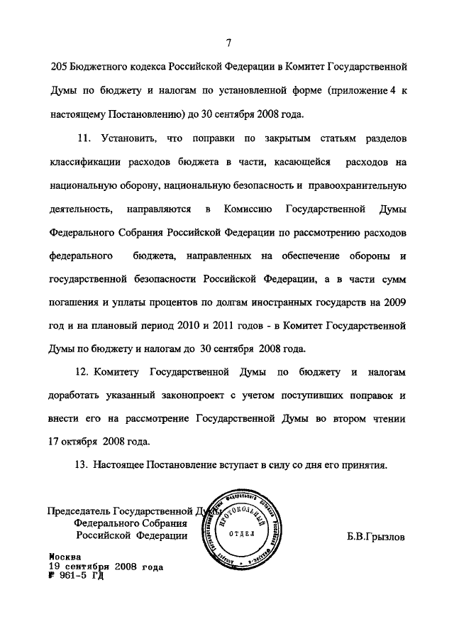 ПОСТАНОВЛЕНИЕ ГД ФС РФ от 19.09.2008 N 961-5 ГД