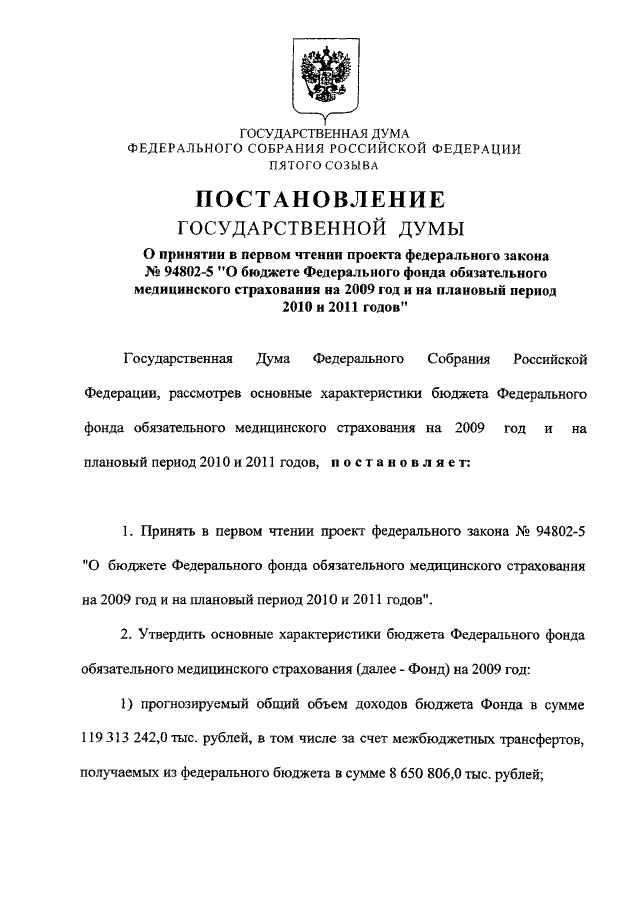 "О ПРИНЯТИИ В ПЕРВОМ ЧТЕНИИ ПРОЕКТА ФЕДЕРАЛЬНОГО ЗАКОНА N 94802-5 "О БЮДЖЕТЕ ФЕДЕРАЛЬНОГО ФОНДА ОБЯЗАТЕЛЬНОГО МЕДИЦИНСКОГО СТРАХОВАНИЯ НА 2009 ГОД И НА ПЛАНОВЫЙ ПЕРИОД 2010 И 2011 ГОДОВ"