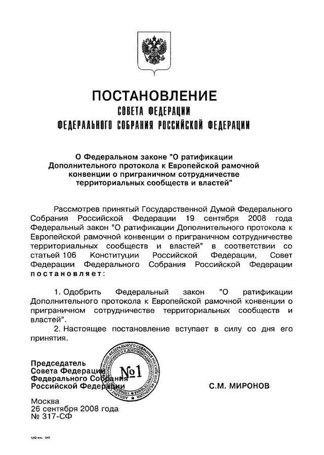 ПОСТАНОВЛЕНИЕ СФ ФС РФ от 26.09.2008 N 317-СФ