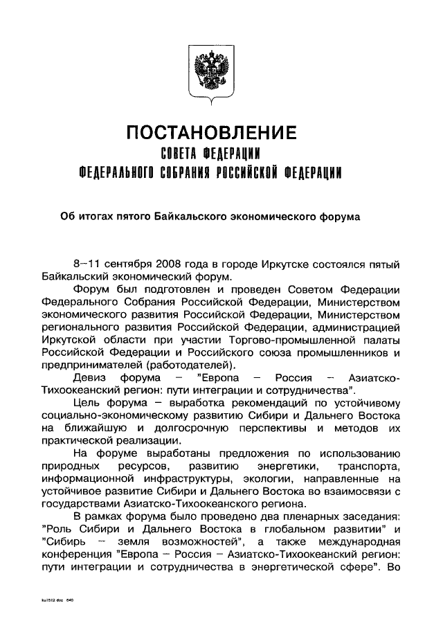 "ОБ ИТОГАХ ПЯТОГО БАЙКАЛЬСКОГО ЭКОНОМИЧЕСКОГО ФОРУМА"