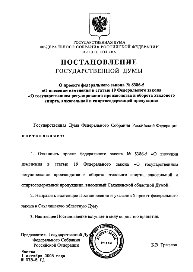 ПОСТАНОВЛЕНИЕ ГД ФС РФ от 01.10.2008 N 978-5 ГД