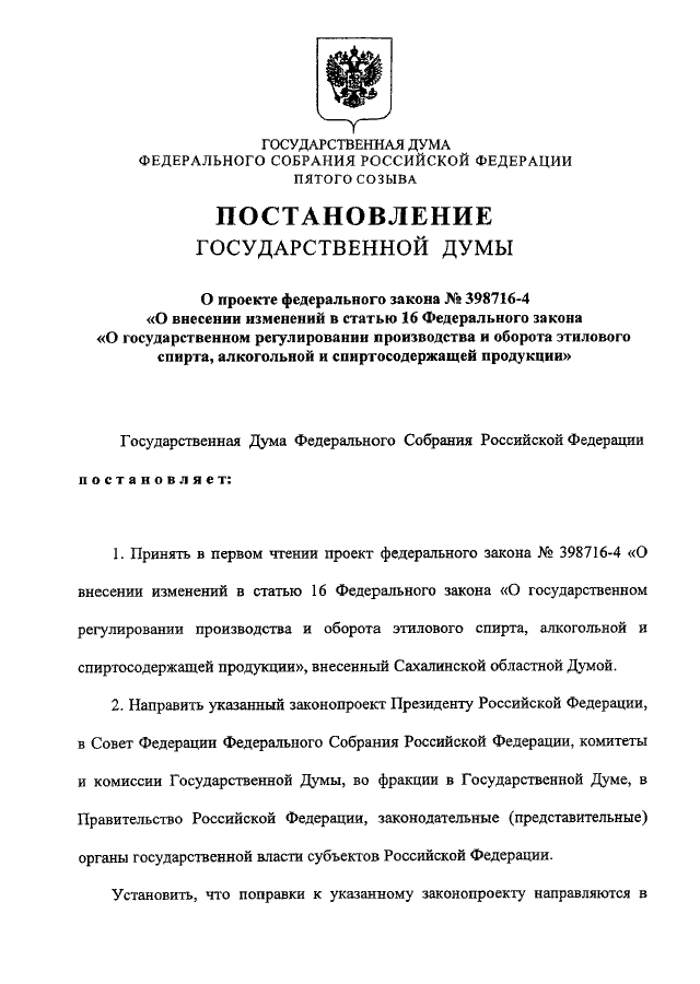 "О ПРОЕКТЕ ФЕДЕРАЛЬНОГО ЗАКОНА N 398716-4 "О ВНЕСЕНИИ ИЗМЕНЕНИЙ В