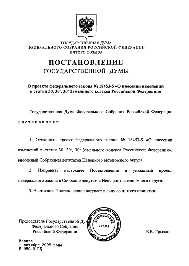ПОСТАНОВЛЕНИЕ ГД ФС РФ от 01.10.2008 N 980-5 ГД