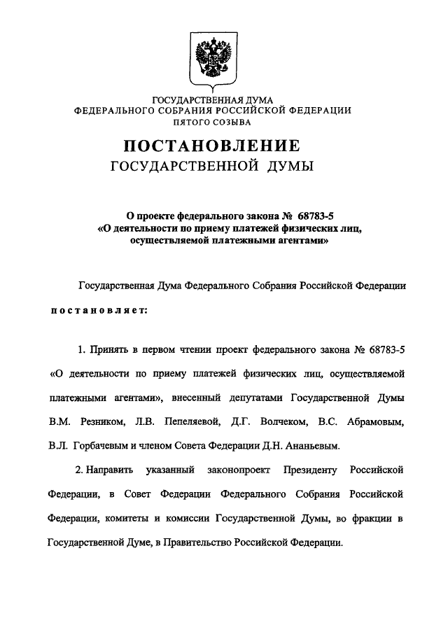 "О ПРОЕКТЕ ФЕДЕРАЛЬНОГО ЗАКОНА N 68783-5 "О ДЕЯТЕЛЬНОСТИ ПО ПРИЕМУ ПЛАТЕЖЕЙ ФИЗИЧЕСКИХ ЛИЦ, ОСУЩЕСТВЛЯЕМОЙ ПЛАТЕЖНЫМИ АГЕНТАМИ"