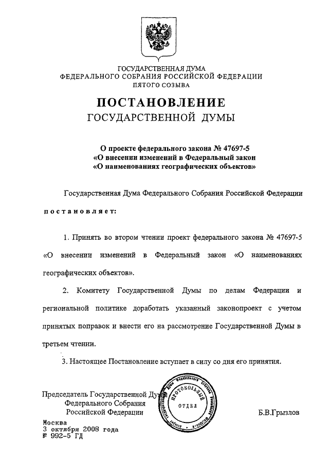 ПОСТАНОВЛЕНИЕ ГД ФС РФ от 03.10.2008 N 992-5 ГД
