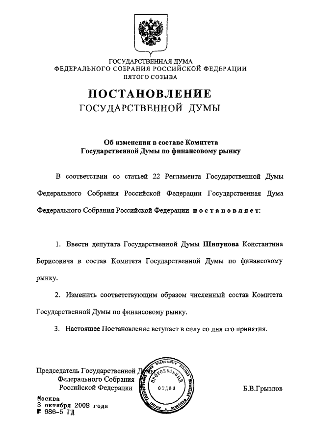 ПОСТАНОВЛЕНИЕ ГД ФС РФ от 03.10.2008 N 986-5 ГД