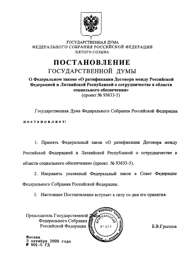 ПОСТАНОВЛЕНИЕ ГД ФС РФ от 03.10.2008 N 991-5 ГД