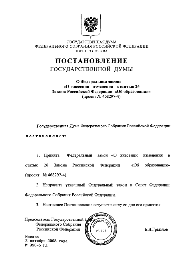 ПОСТАНОВЛЕНИЕ ГД ФС РФ от 03.10.2008 N 990-5 ГД