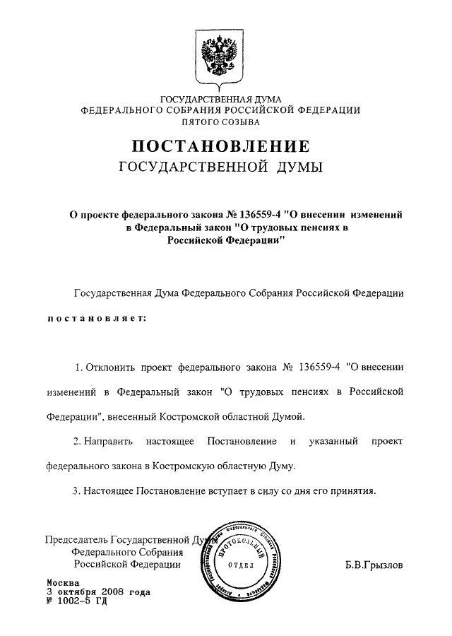 ПОСТАНОВЛЕНИЕ ГД ФС РФ от 03.10.2008 N 1002-5 ГД
