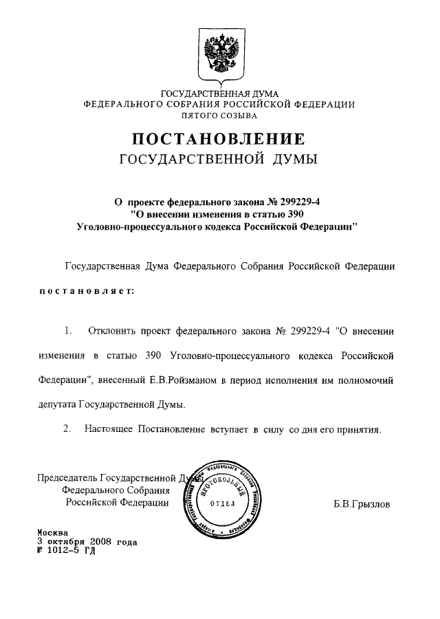 ПОСТАНОВЛЕНИЕ ГД ФС РФ от 03.10.2008 N 1012-5 ГД