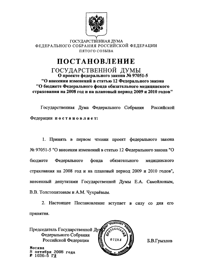 ПОСТАНОВЛЕНИЕ ГД ФС РФ от 08.10.2008 N 1026-5 ГД