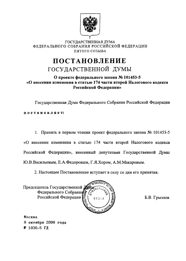 ПОСТАНОВЛЕНИЕ ГД ФС РФ от 08.10.2008 N 1030-5 ГД