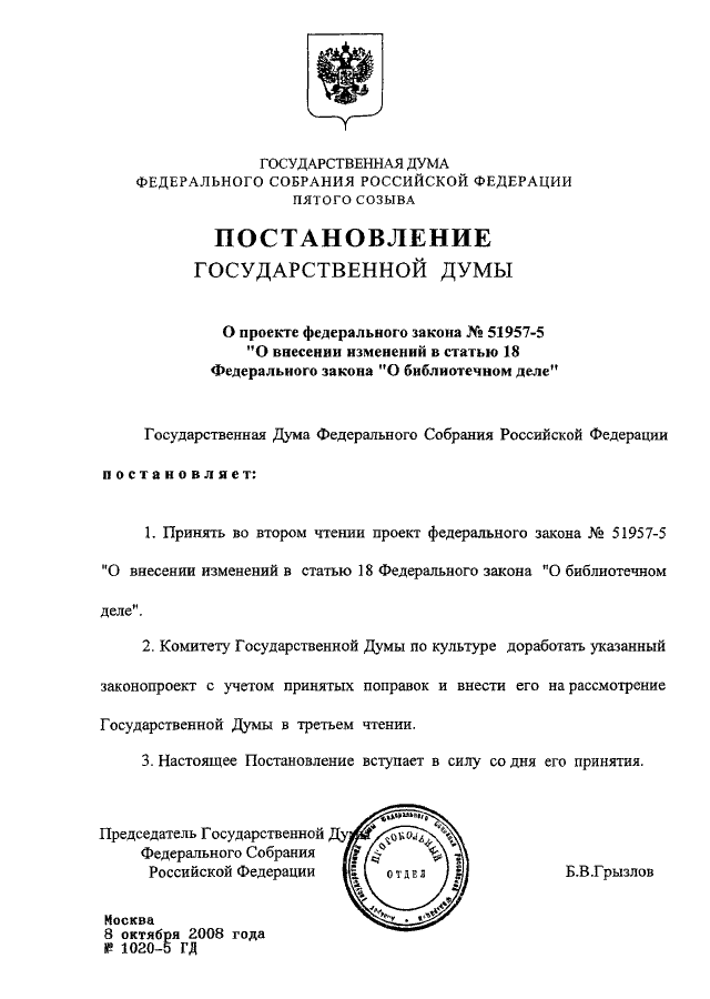 ПОСТАНОВЛЕНИЕ ГД ФС РФ от 08.10.2008 N 1020-5 ГД
