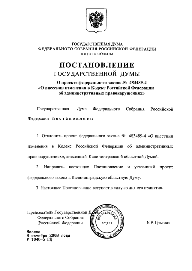 ПОСТАНОВЛЕНИЕ ГД ФС РФ от 08.10.2008 N 1040-5 ГД