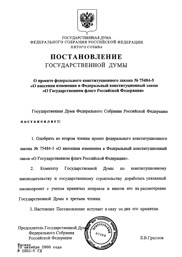 ПОСТАНОВЛЕНИЕ ГД ФС РФ от 10.10.2008 N 1052-5 ГД