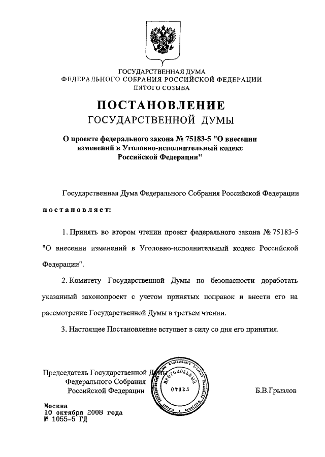 ПОСТАНОВЛЕНИЕ ГД ФС РФ от 10.10.2008 N 1055-5 ГД