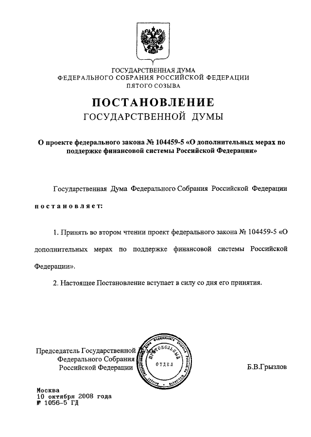 ПОСТАНОВЛЕНИЕ ГД ФС РФ от 10.10.2008 N 1056-5 ГД