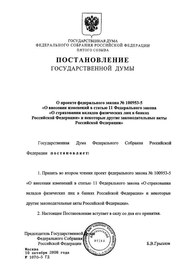ПОСТАНОВЛЕНИЕ ГД ФС РФ от 10.10.2008 N 1076-5 ГД