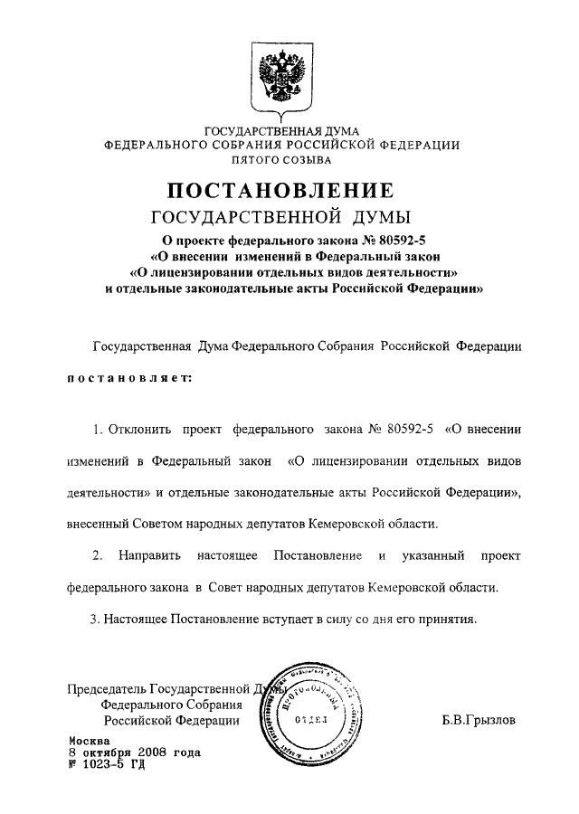 ПОСТАНОВЛЕНИЕ ГД ФС РФ от 08.10.2008 N 1023-5 ГД