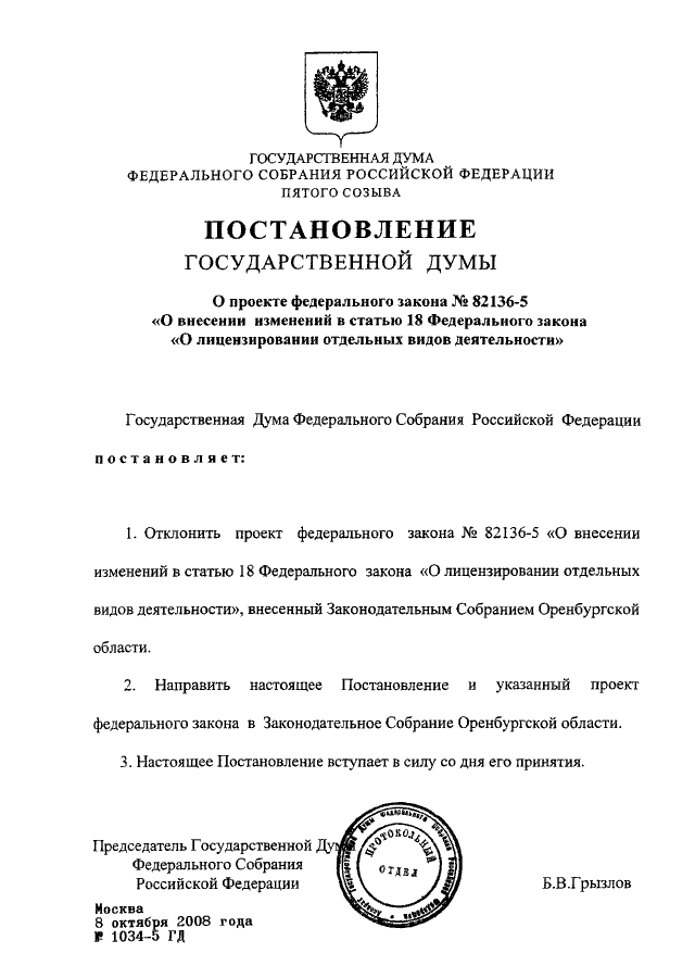 ПОСТАНОВЛЕНИЕ ГД ФС РФ от 08.10.2008 N 1034-5 ГД