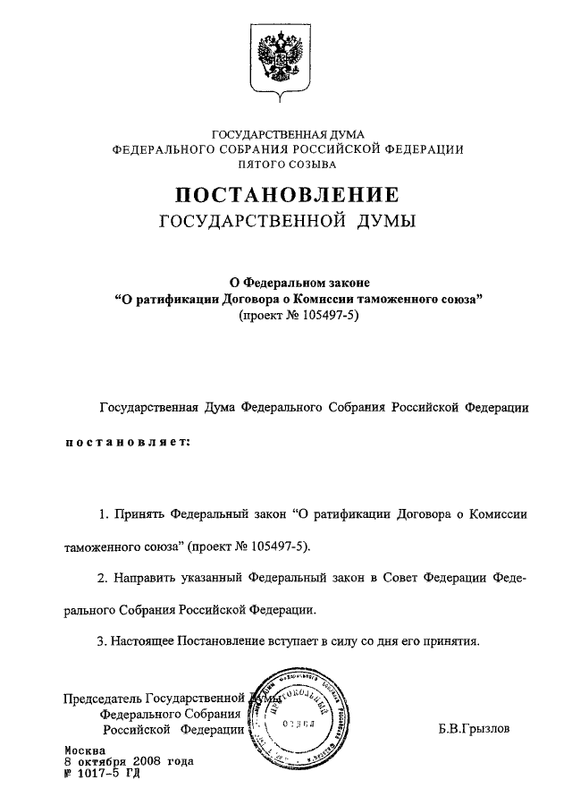 ПОСТАНОВЛЕНИЕ ГД ФС РФ от 08.10.2008 N 1017-5 ГД