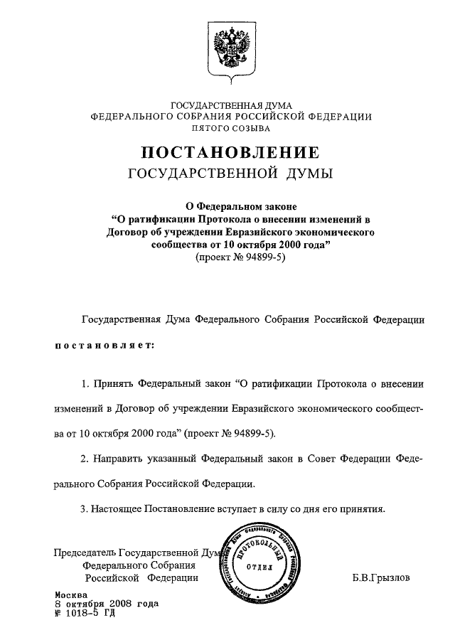 "О ФЕДЕРАЛЬНОМ ЗАКОНЕ "О РАТИФИКАЦИИ ПРОТОКОЛА О ВНЕСЕНИИ ИЗМЕНЕНИЙ В ДОГОВОР ОБ УЧРЕЖДЕНИИ ЕВРАЗИЙСКОГО ЭКОНОМИЧЕСКОГО СООБЩЕСТВА ОТ 10 ОКТЯБРЯ 2000 ГОДА" (ПРОЕКТ N 94899-5)"
