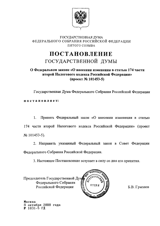 ПОСТАНОВЛЕНИЕ ГД ФС РФ от 08.10.2008 N 1031-5 ГД