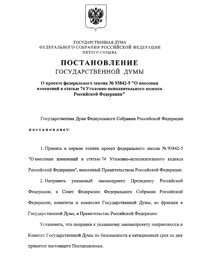 "О ПРОЕКТЕ ФЕДЕРАЛЬНОГО ЗАКОНА N 93842-5 "О ВНЕСЕНИИ ИЗМЕНЕНИЙ В СТАТЬЮ 74 УГОЛОВНО - ИСПОЛНИТЕЛЬНОГО КОДЕКСА РОССИЙСКОЙ ФЕДЕРАЦИИ"