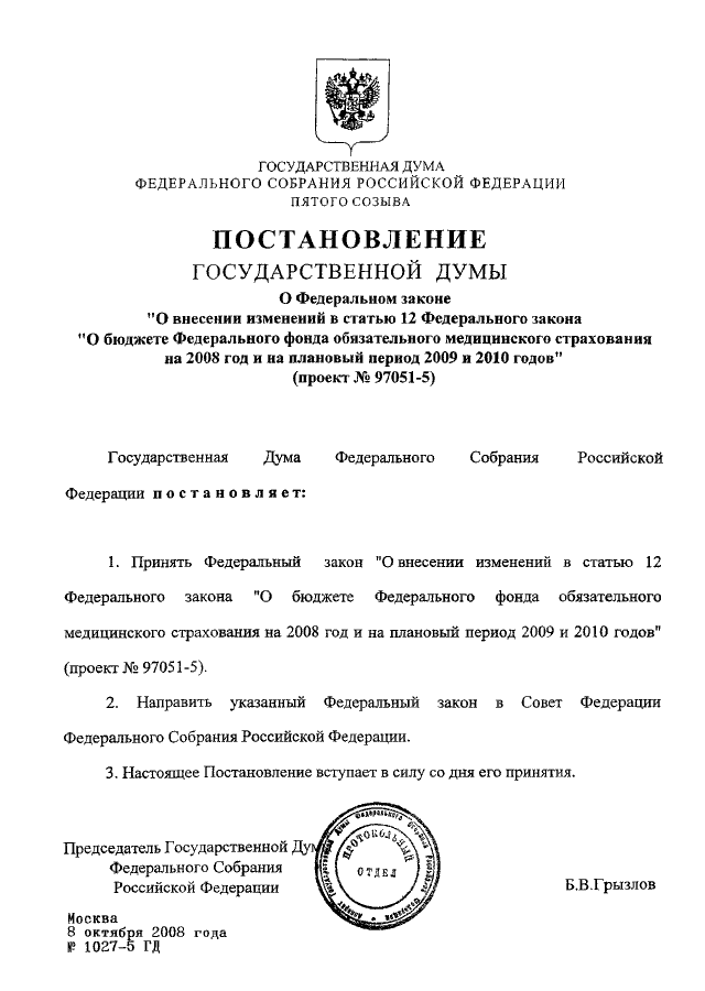 ПОСТАНОВЛЕНИЕ ГД ФС РФ от 08.10.2008 N 1027-5 ГД