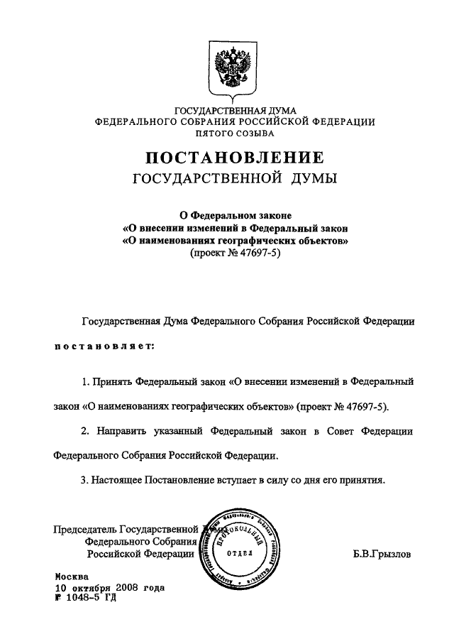 ПОСТАНОВЛЕНИЕ ГД ФС РФ от 10.10.2008 N 1048-5 ГД