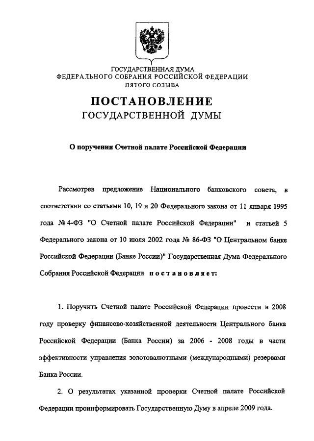 "О ПОРУЧЕНИИ СЧЕТНОЙ ПАЛАТЕ РОССИЙСКОЙ ФЕДЕРАЦИИ"
