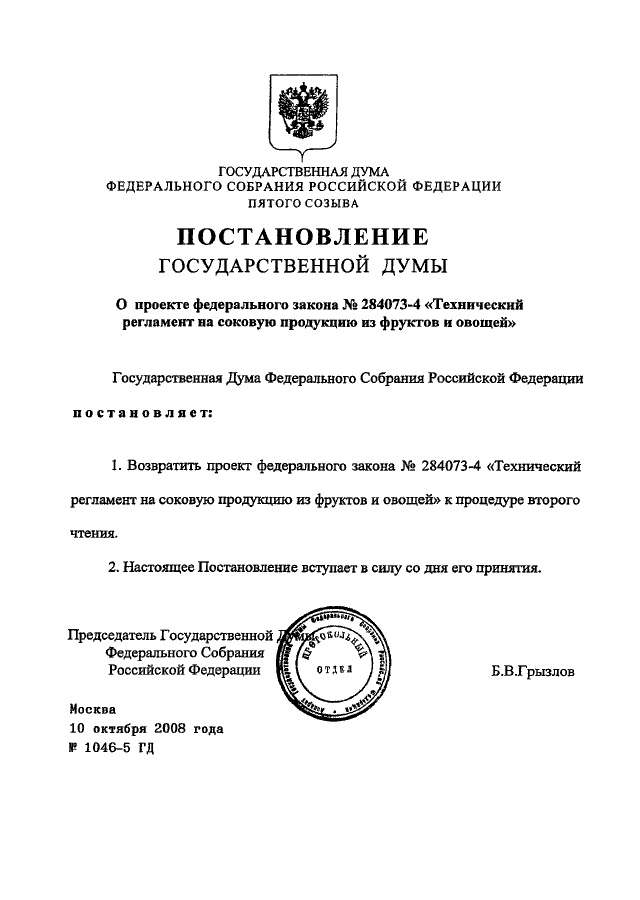 ПОСТАНОВЛЕНИЕ ГД ФС РФ от 10.10.2008 N 1046-5 ГД