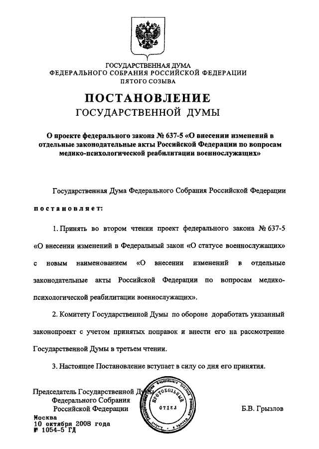 ПОСТАНОВЛЕНИЕ ГД ФС РФ от 10.10.2008 N 1054-5 ГД