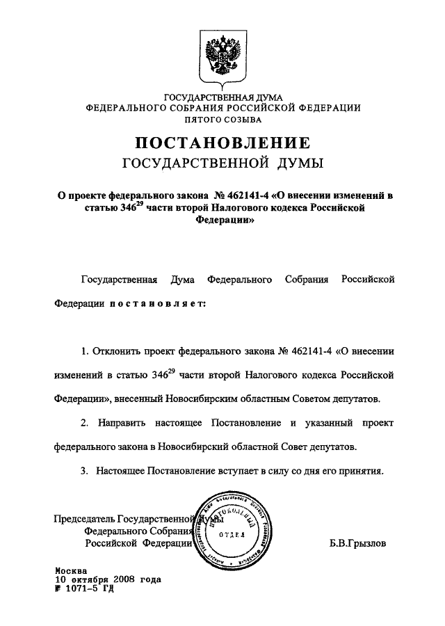 ПОСТАНОВЛЕНИЕ ГД ФС РФ от 10.10.2008 N 1071-5 ГД