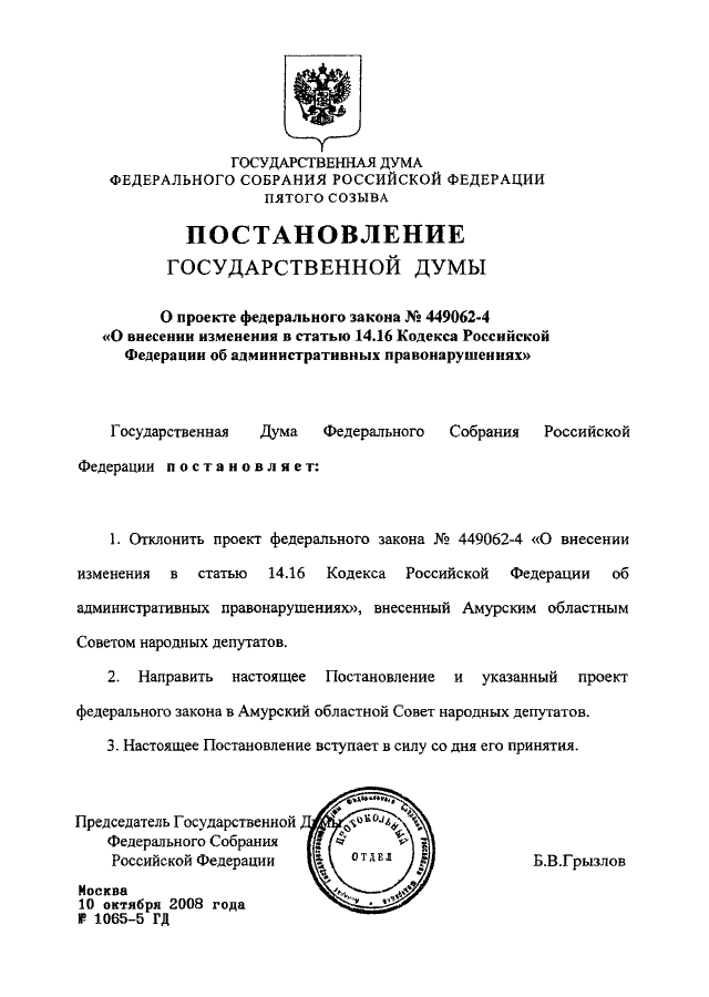 ПОСТАНОВЛЕНИЕ ГД ФС РФ от 10.10.2008 N 1065-5 ГД