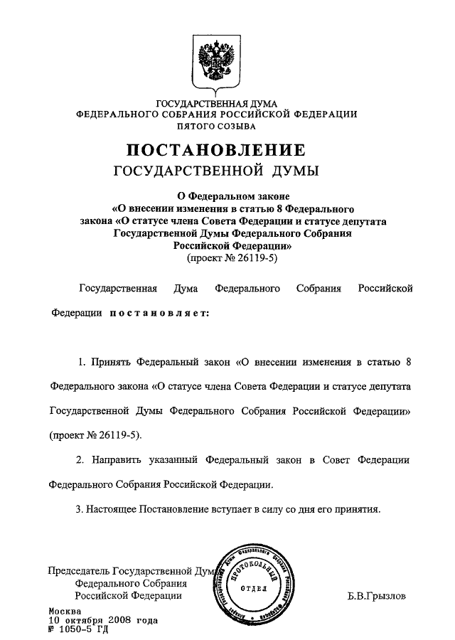 ПОСТАНОВЛЕНИЕ ГД ФС РФ от 10.10.2008 N 1050-5 ГД