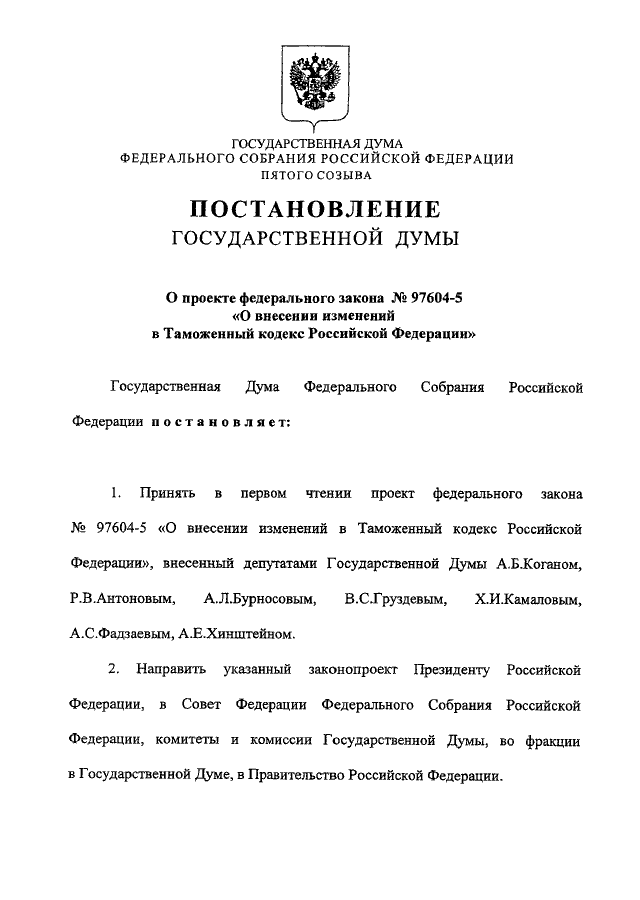"О ПРОЕКТЕ ФЕДЕРАЛЬНОГО ЗАКОНА N 97604-5 "О ВНЕСЕНИИ ИЗМЕНЕНИЙ В ТАМОЖЕННЫЙ КОДЕКС РОССИЙСКОЙ ФЕДЕРАЦИИ"