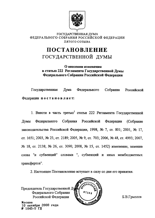 ПОСТАНОВЛЕНИЕ ГД ФС РФ от 10.10.2008 N 1045-5 ГД