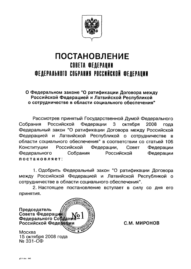 ПОСТАНОВЛЕНИЕ СФ ФС РФ от 15.10.2008 N 331-СФ